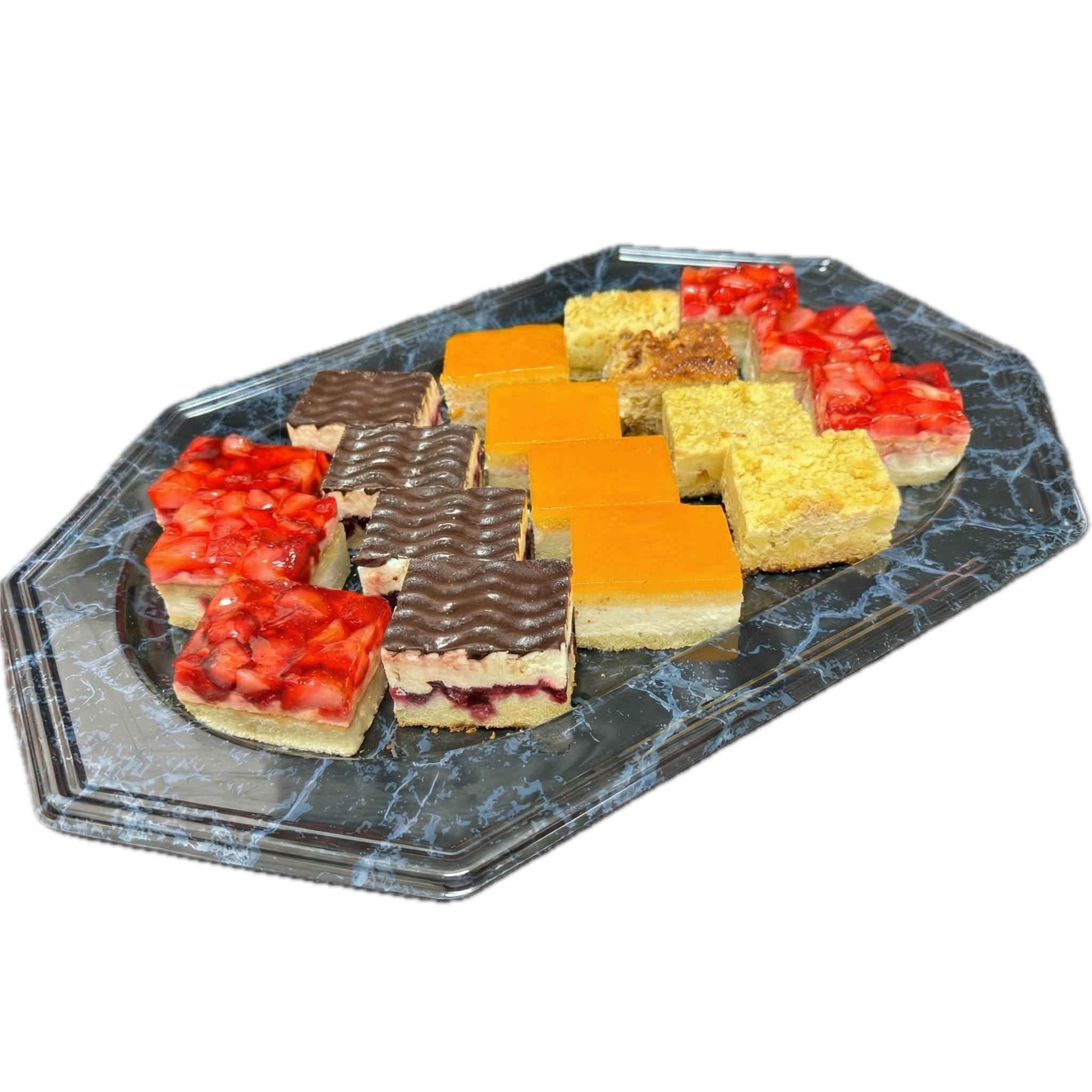 Die Kuchenstücke sind liebevoll dekoriert und bieten eine bunte Mischung aus verschiedenen Sorten. Von saftigen Obstkuchen über cremige Käsekuchen bis hin zu klassischen Schokoladenkuchen. Diese Platte hat für jeden etwas dabei. Unsere Kuchen werden aus hochwertigen Zutaten frisch zubereitet, um Ihnen die beste Qualität und den besten Geschmack zu garantieren.